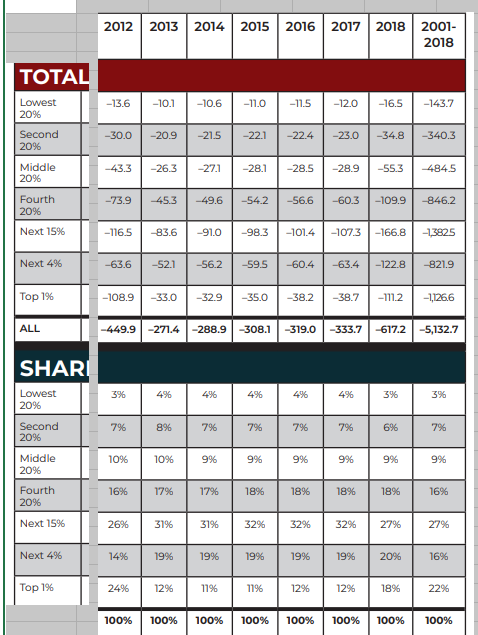 Here’s a table from The Institute for Taxation and Economic Policy showing revenue losses and shares 2012 to 2018: