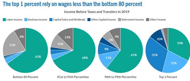 For the top one percent, 31% of their income comes from capital gains, currently taxed at a top rate of 20% (the first $600,000 is taxed at 15%). Trump’s Tax Cuts and Jobs Act also created a special break for pass-through income, used by many partnerships in real estate, law, accounting, or small businesses. That special break allowed a business deduction of 20%, taxed at 29.6%, for that income. 22% of the income of the top 1% comes from business income where these deductions are available. Only 33% of income of the top 1% comes from wages and salaries, where the top marginal rate would apply. Even among the next top 4%, only 61% of their income comes from labor compensation. For a married couple the estate tax doesn’t kick in unless the estate is valued at $22 million.