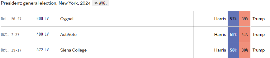 Although New York is not a swing state, I am encouraged by the polls in New York, where months ago first President Biden, and then Kamala Harris, were defeating Trump with nowhere near the 2020 margins, where Biden beat him 61-38. That has changed. Here are the most recent polls: