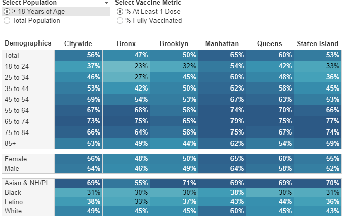 Uncategorized Older Brooklyn residents have lowest vaccination rates among City’s 65+ by jimbrennancommentariesMay 7, 2021 Comments 0 Source: NYC DOH vaccine tracker May 7,2021 Share this: Click to share on Bluesky (Opens in new window) Bluesky Click to share on Reddit (Opens in new window) Reddit Click to share on Threads (Opens in new window) Threads Click to share on WhatsApp (Opens in new window) WhatsApp Post Click to email a link to a friend (Opens in new window) Email Discover more from Jim Brennan's Commentaries Subscribe to get the latest posts sent to your email. 0 comments on “Older Brooklyn residents have lowest vaccination rates among City’s 65+” Leave a ReplyCancel reply This site uses Akismet to reduce spam. Learn how your comment data is processed. Post navigation Previous Post Next Post