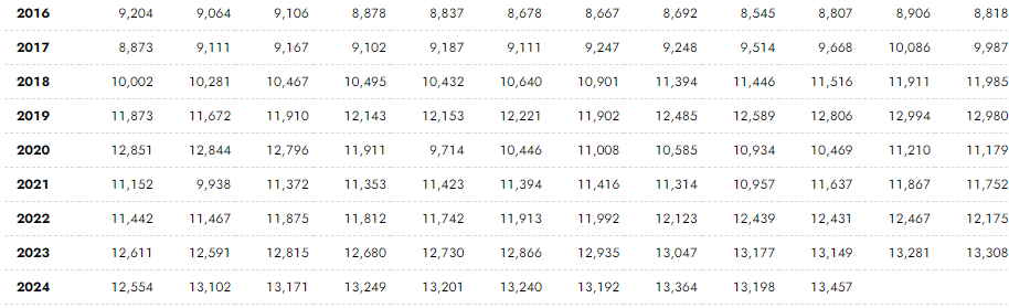 The final column of each year is December, and that is where you can see the year-over-year price increase. In the first three years of Trump, food price inflation ran 1.6-1.8% a year, but in 2020, despite low overall inflation, food prices rose 3.9%. During President Biden’s term, food price inflation peaked at over 10% in 2022. In 2023 through November 2024, it calmed down to 2.7% and 2.4%. Overall, food price inflation has been over 23% during Biden’s four years.