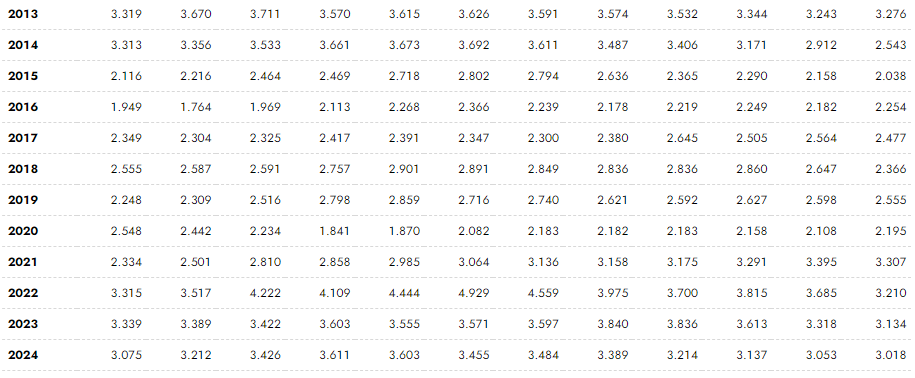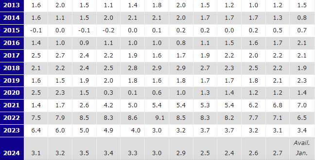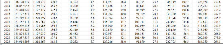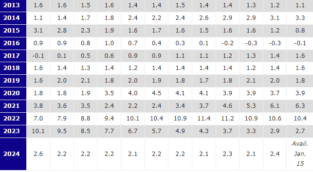 The year- over- year inflation rates can be seen in the final column for December of each year. The CPI Index (Consumer Price Index) in the first year of Obama’s second term, in December 2013, showed 1.5% inflation. Trump’s years had inflation at 2.1% in 2017, 1.9% in 2018, 2.3% in 2019, and 1.4% in 2020, the pandemic year. Under President Biden, in 2021, the COVID recovery year, inflation was 7.0%. In 2022, the year of the Russian invasion of Ukraine, inflation was 6.5%. In 2023 inflation was 3.4%, and as of November 2024 year over year inflation is 2.7%.