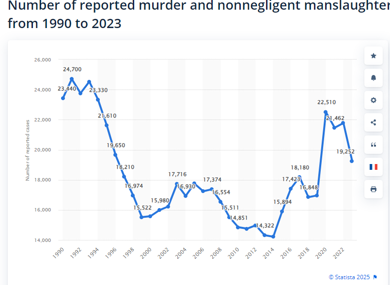 Homicides in the United States rose 30% in 2020 from 2019 in the pandemic year in which Trump was president. The rate rose to 6.8/100,00 in 2020 from 5.2 per 100,000 in 2019, and dropped to 6.5/100,000 in 2021 and 2022 before declining more rapidly in 2023 and the first six months of 2024 ( noted above) to the 2019 level.
