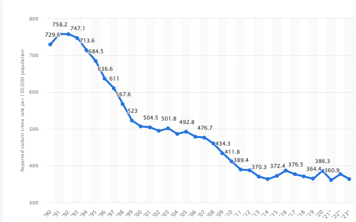 The graph shows that, despite the rise in violent crime that occurred in 2020, overall violent crime was higher before 2010 and earlier, and is half the rate per 100,000 population compared to the early nineteen-nineties. The violent crime rate was 363.8 per 100,000 in 2023, and the F.B.I. reported that violent crime fell 10% in the first six months of 2024 compared to the first six months of 2023.