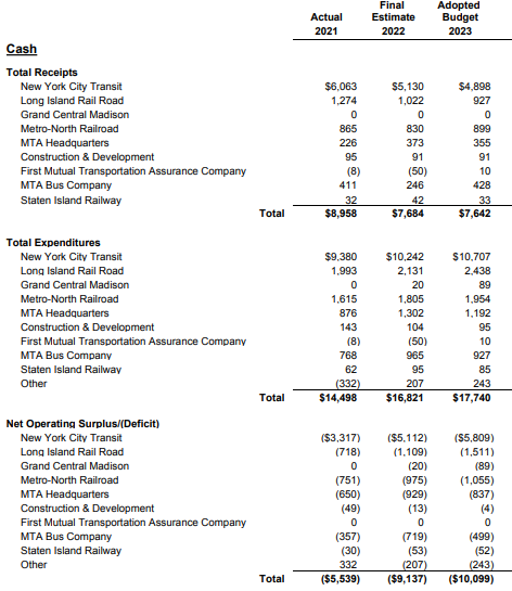 According to the MTA’s February 2023 Financial Plan, the Long Island Railroad will have, in 2023, a $1.5 billion deficit between its revenues from the riders (and reimbursements from the capital budget) versus its expenses like payroll, energy, and so on. MetroNorth’s deficit is about $1 billion; New York City Transit’s deficit, larger, of course, is $5.8 billion. Here’s the MTA’s Deficits by system, based on the MTA’s Adopted budget for February 2023: