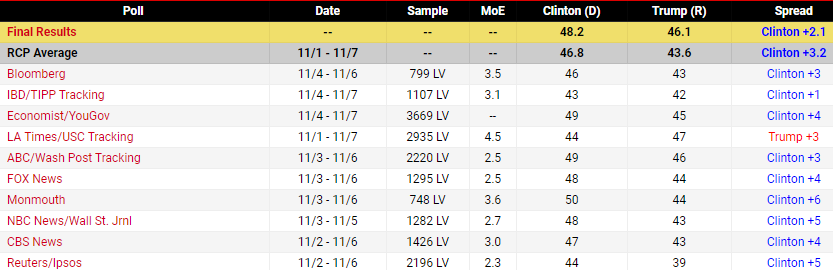 A review of the final six weeks of polls in the Clinton Trump campaign from Real Clear Politics are painfully instructive. In the first three weeks of October 2016 Clinton was leading by an average of six points; by the second to last week, she was leading by four points. By the last week before the election, her lead was an average of 3.2 points, Here are the last ten polls: