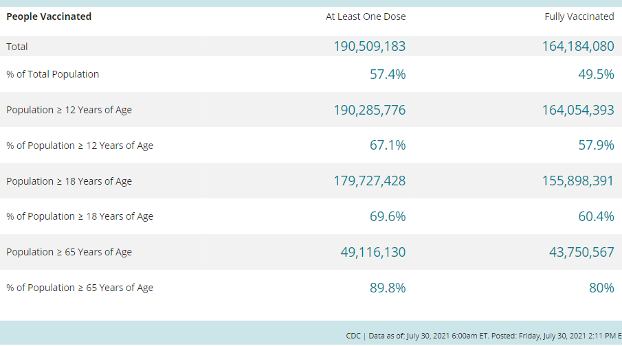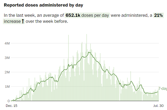 The number of new vaccinations is increasing. This Washington Post graph, drawn from CDC data, indicates that about 857,000 vaccine doses were administered on July 29th, the highest number since July 3rd https://wapo.st/3rMRDKS At this rate, the U.S. should reach 70% of adults with at least one dose within the next few days. It is necessary to link to the WP article and hover your cursor over the graph to see the daily numbers.